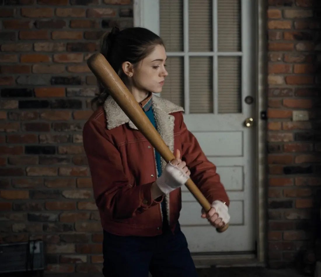 Nancy takes her friend’s disappearance hard. And personally. When Barb’s fate is revealed, Nancy is crushed and forever changed. Not all at once, but in believable increments, over the next four seasons, her character shifts from grief and depression to baseball bat wielding bad assery. First she goes by the books, trying to solve the mystery of Barb, and the mystery of the Upside Down, like a journalist. But as more casualties fall, and the town descends into monstrous chaos, she takes on an edge, visible in her countenance, her walk, and her unabashed ovaries-out bravery.